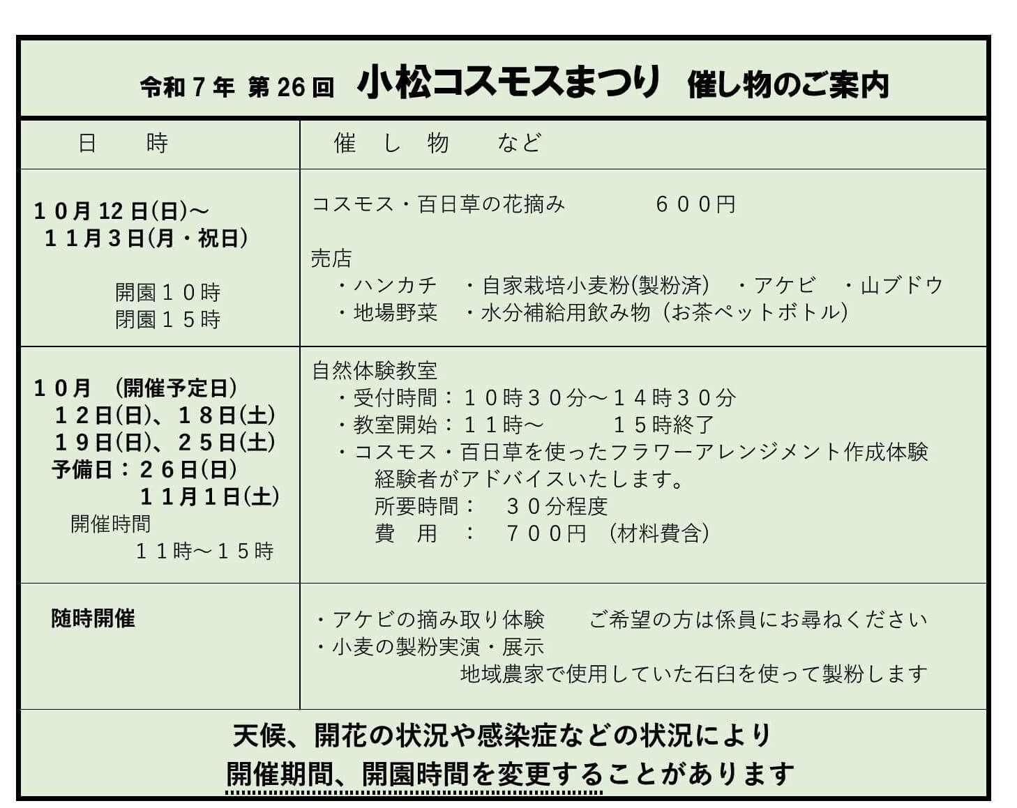 コスモス・百日草の花摘み(有料)、フラワーアレンジメント教室(有料)、アケビの摘み取り体験、小麦の製粉実演・展示、地場野菜の販売等等