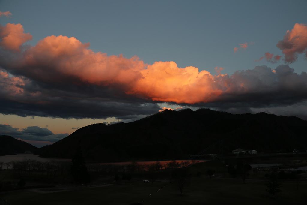「第31回宮ケ瀬クリスマスみんなのつどい ~光のメルヘン~」も25日(日)まで残りわずか。大賑わいの湖畔園地に繰り出し、まずは清川村名物「恵水ポーク」の生ウィンナーやスモークターキーで腹ごしらえをしていると、高取山の上にかかる雲がオレンジ色に輝いていました。