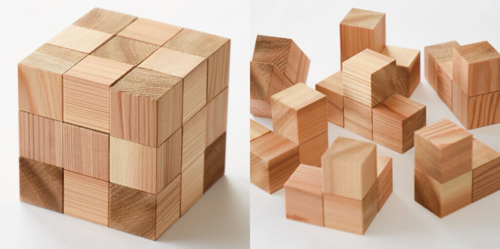 遊び方は一辺が3センチほどの立方体3、4個で構成される7つのパーツをうまく組み合わせて、3×3×3個の大きな立方体を作ります。その組み立て方はなんと176通りあるといいます。子どもにとっては立体的にものを考える基礎づくりに役立ち、シニア世代にとっては脳トレに役立つとして愛用されています。