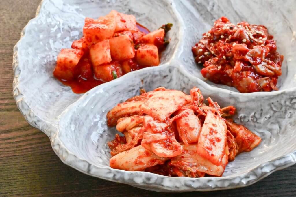 キムチハウスで人気の白菜キムチ(手前)とカクテキ(左奥)、チャンジャ(右奥)