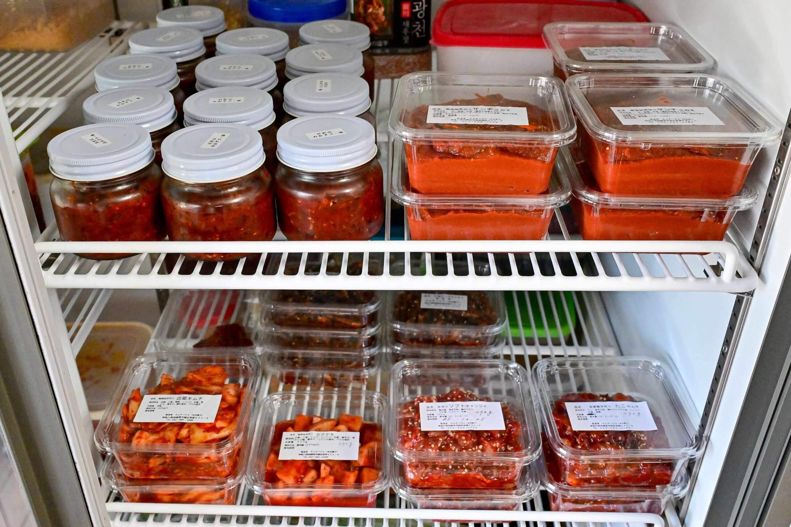店内の冷蔵庫には、販売用のパックに仕分けられたキムチがずらり